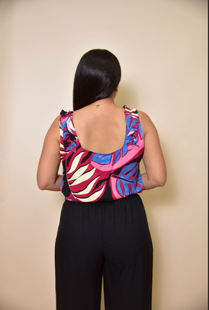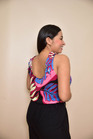 Blusa negra con estampado en colores vainilla , blanco, azul, vino y fucsia, que crean un contraste elegante y moderno. Su diseño incluye un lazo ajustable en la cintura, que le da un toque sofisticado y estructurado. Ideal para un look formal o semi-formal, esta falda combina la fluidez de su caída en puntas laterales con un estilo clásico y refinado.