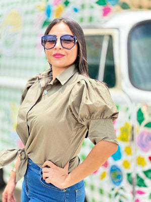 Camisa en color verde militar, con mangas globo que aportan volumen y un estilo romántico. Gracias a su tela fresca y transpirable, te mantiene fresca y cómoda todo el día. Además, su estilo clásico y elegante te hace lucir bien en cualquier ocasión.