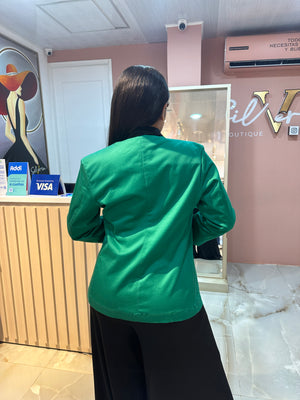 Este es un blazer femenino, en un vibrante tono verde esmeralda. A diferencia de los otros modelos, este diseño tiene un estilo minimalista, sin solapas clásicas, lo que le da un aire más moderno y limpio. El escote es en “V” profundo, y se cierra al frente con un único botón en tono madera claro, lo cual añade un detalle natural y sutil al look.