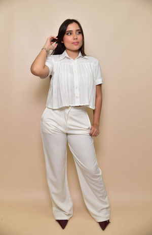 La Camisa Vanessa eleva la clásica camisa blanca con pliegues delanteros y corte ligero en lino. Atemporal, fresca y perfecta para looks pulidos de día o de noche.