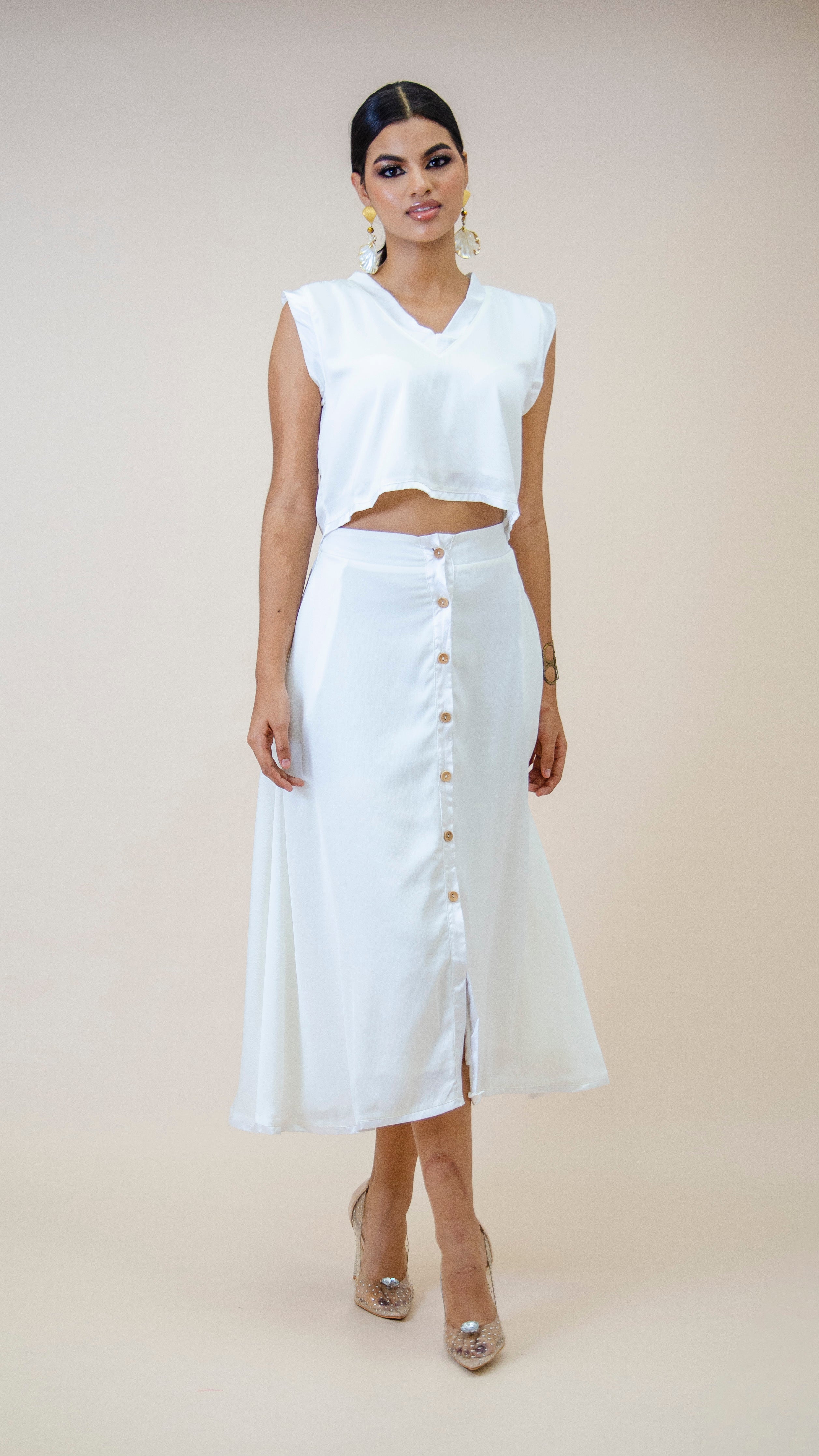 La falda con un corte fluido y ligeramente acampanado, ofrece una caída suave y elegante gracias a la seda, que le da un toque lujoso. El color blanco aporta frescura y luminosidad, haciéndola perfecta para climas cálidos o para eventos al aire libre. Además, su longitud crea una silueta femenina y estilizada, mientras que el movimiento del tejido proporciona un aire etéreo y ligero.