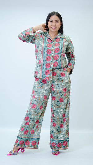Camisa manga larga confeccionada en tela de seda con estampado de rosas.