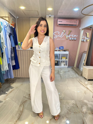 Este chaleco es una prenda fresca, ideal para el clima cálido. Su diseño ajustado resalta la figura, mientras que los botones en el frente añaden un toque clásico y elegante. Perfecto para combinar con prendas casuales o para darle un giro moderno a un look más formal, este chaleco aporta un toque de  estilo único.