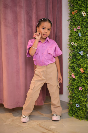Set de niña en colores beige y lila, compuesto por camisa y pantalón estilo cargo y de apariencia oversize.