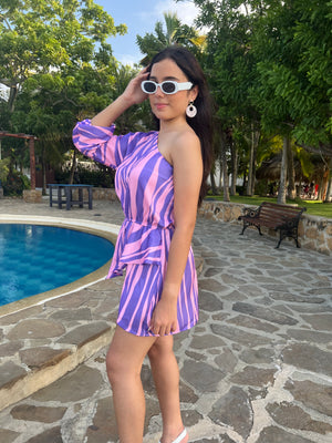 Es una prenda elegante y atrevida que combina colores vibrantes con un toque moderno. El morado y lila se mezclan perfectamente, creando un contraste suave pero impactante, ideal para quienes buscan destacar con un estilo único.