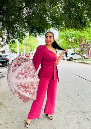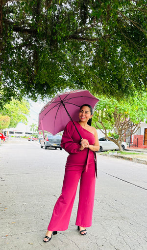 Es una prenda sofisticada y llena de estilo que destaca por su color profundo y elegante. El vino tinto, rico y vibrante, aporta un toque de lujo y calidez, mientras que el fajón en la cintura acentúa la figura y agrega un detalle chic y ajustable.