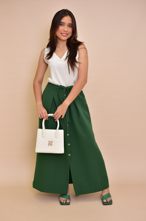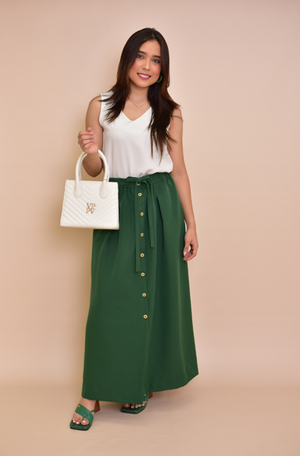 Su largo brinda un toque sofisticado, mientras que el color verde evoca frescura y conexión con la naturaleza. Cuenta con un corte recto y botonadura en su zona frontal. Este tipo de falda es ideal para combinar con blusas ajustadas o tops simples, dependiendo del look que quieras lograr, ya sea casual o más formal.
