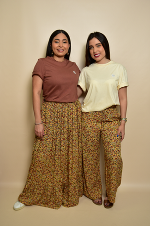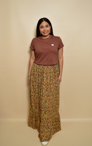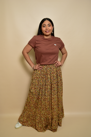 Falda con un hermoso estampado floral que evoca frescura y elegancia. Confeccionado en tejido 100% rayón viscosa, ofrece una textura ligera y transpirable, ideal para climas cálidos. El estampado floral de colores cálidos aporta un aire alegre y sofisticado, mientras que la mezcla de tejidos proporciona comodidad y durabilidad.