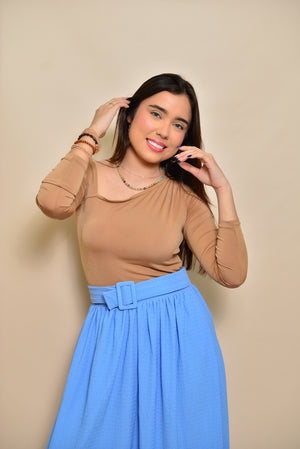 Esta falda azul celeste está confeccionada en tejido 98% poliéster y 2% elastómero, con correa ajustable y elástico en la cintura para lograr el ajuste perfecto. El diseño resalta por su delicadeza, aportando un aire romántico y natural. Ideal para ocasiones casuales o semi-formales, su estilo ligero y aireado ofrece comodidad sin sacrificar sofisticación.
