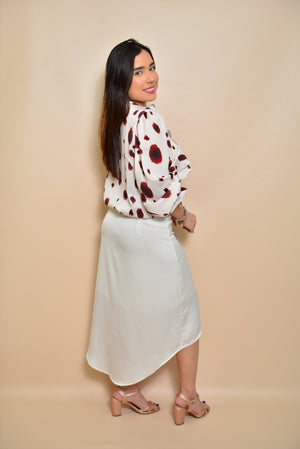 Esta falda en color blanco es una prenda de estilo audaz y contemporáneo. El corte asimétrico le da un toque moderno y dinámico, mientras que los botones en el frente añaden un detalle elegante y llamativo, completando el diseño con un aire sofisticado. Ideal para un look chic y original, perfecta para ocasiones especiales o eventos donde se desea destacar.