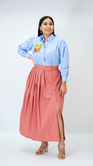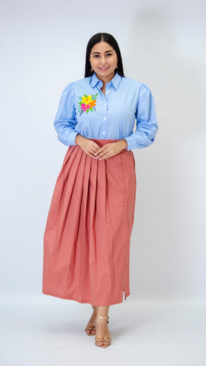El diseño plisado de la falda le da un efecto de movimiento y volumen, creando una silueta fluida que es a la vez cómoda y estilizada. Las pliegues le dan un toque dinámico y estructurado, mientras que la abertura en el costado aporta un toque de sensualidad, permitiendo mayor libertad de movimiento y añadiendo un elemento de sorpresa al diseño. El color terracota es muy versátil y se puede combinar fácilmente con tonos neutros como blanco, negro o beige, o incluso con colores más vibrantes para un contraste llamativo.