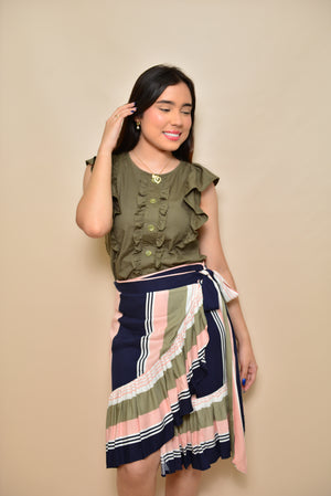 Falda corta de diseño moderno y elegante, estampado en tonos verde, blanco, rosa y azul, que le aporta un aire natural y elegante. Su diseño incluye un recogido a un lado, creando un efecto asimétrico que añade un toque sofisticado y único. Además, incluye un delicado bolero inferior que añade un toque de estilo y feminidad. Esta prenda es ideal para ocasiones casuales o eventos especiales, combinando a la perfección con blusas ajustadas o tops elegantes. Fabricada con materiales de alta calidad para garantizar comodidad y durabilidad.
