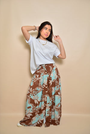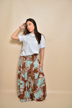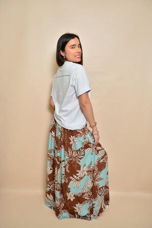 Nuestra falda Tulia es una prenda elegante y versátil, diseñada con un hermoso estampado floral en tonos, café, blanco y azul agua marina. Se cierra con una serie de botones cuidadosamente colocados en la parte frontal. Además, presenta una abertura en la parte inferior que no solo ofrece mayor movimiento, sino que también añade un detalle chic al diseño. Esta falda es ideal para diversas ocasiones, desde un día casual hasta una salida más formal, combinando estilo y confort en una sola prenda.