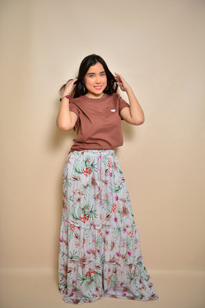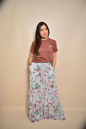Falda con un hermoso estampado floral en tonos blancos, azules, verdes , rosas y grises, creando una combinación fresca y elegante. Tiene bolsillos laterales para mayor practicidad y elástico en la cintura que brinda un ajuste cómodo y flexible, adaptándose al cuerpo con facilidad. El diseño resalta por su delicadeza, con flores que parecen fluir suavemente sobre la tela, aportando un aire romántico y natural. Ideal para ocasiones casuales o semi-formales, su estilo ligero y aireado ofrece comodidad sin sacrificar sofisticación.