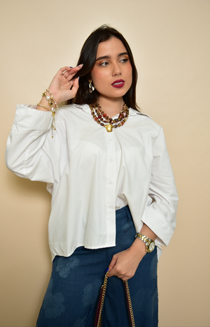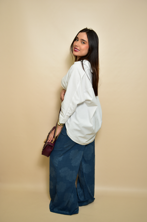 Camisa amplia confeccionada. Cuello solapa y manga larga acabada en puño. Bajo asimétrico redondeado. Cierre frontal con botones.