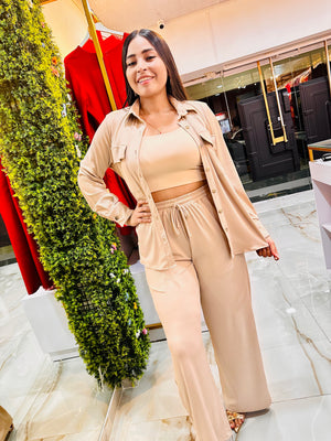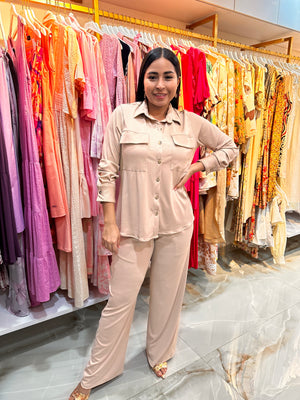 Pantalón Beige claro o arena, un tono neutro, sofisticado y fácil de combinar , viene con un estilo Palazzo, con piernas muy amplias desde la cadera hasta el bajo, creando un efecto de caída fluida y elegante. Ideal para looks frescos, naturales y atemporales.