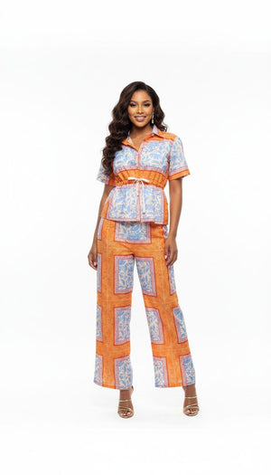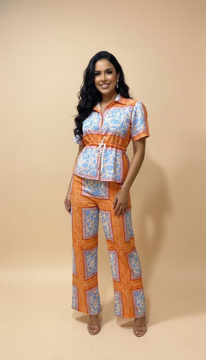 Este conjunto destaca por su estilo vibrante y lleno de personalidad. Está compuesto por una camisa de manga corta con botones frontales, confeccionada en un estampado geométrico que combina tonos naranja y azul, evocando frescura y energía. El detalle ajustable en la cintura con cordón realza la silueta y aporta un toque femenino y moderno.