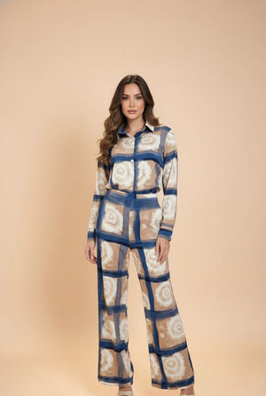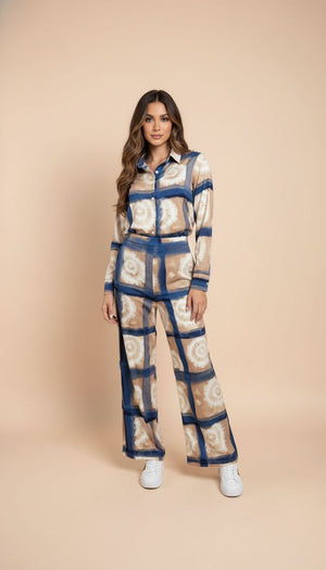 Este conjunto se caracteriza por su estilo artístico y sofisticado. Está compuesto por una camisa de manga larga con botones frontales y cuello clásico, confeccionada en un estampado tipo tie-dye geométrico, donde se fusionan tonos beige y azul profundo, creando un efecto visual moderno y elegante.