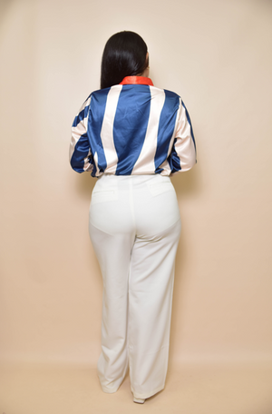 Camisa confeccionada en tela de seda con vivos naranjas en el cuello y bies de botones. es una camisa elegante con una vibrante combinación entre colores beige, azul y naranja.