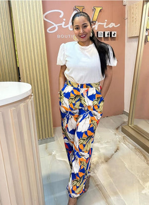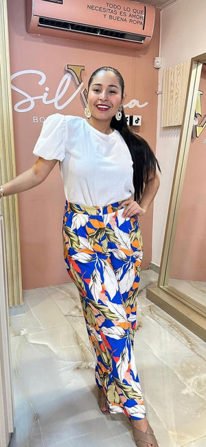 Este pantalón largo es una prenda llamativa y versátil que combina comodidad con estilo. Confeccionado en una tela fluida y liviana, su caída es natural y elegante, adaptándose con movimiento al andar. Lo que lo hace destacar es su estampado, que puede variar desde motivos florales, geométricos, tropicales o abstractos, dependiendo del diseño y la ocasión.