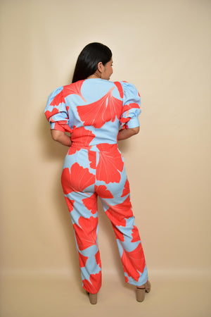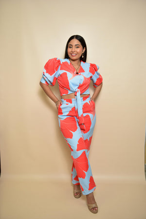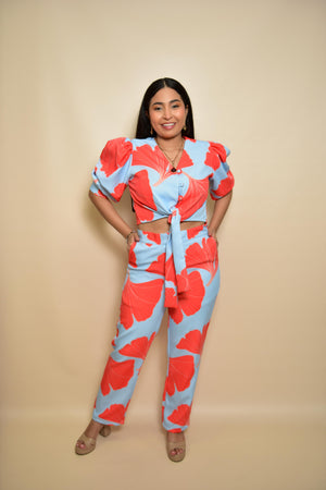 Este pantalón es de bota recta , confeccionado en tela noche de viena. Presenta un estampado vibrante que combina tonos azul y naranja, creando un diseño elegante y fresco. El tejido noche de viena aporta un toque de sofisticación y fluidez a la prenda, ideal para un look moderno y sofisticado.