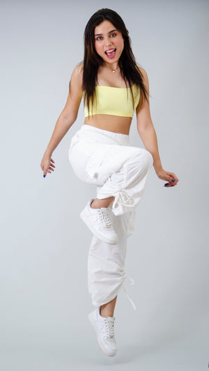 Su color blanco le da un toque limpio y fresco, lo que lo convierte en una opción ideal para la temporada de primavera o verano, ya que se puede combinar fácilmente con tops de colores variados, blusas, camisetas o incluso chaquetas ligeras. El pantalón cargo, gracias a su versatilidad, se puede usar con zapatillas, sandalias o botas, adaptándose tanto a looks casuales como a estilos más urbanos o deportivos.