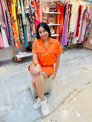 La blusa es manga corta y cuello clásico tipo camisa, botonadura frontal con botones a tono. EL Short es de tiro alto resaltando la cintura. Perfecto para un look veraniego o de paseo.