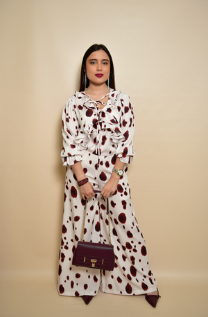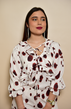 Blusa manga larga estilo boho confeccionada en estampado cow print. Detalle de acabados con volantes y cordón en el mismo tejido de la blusa. Total look.
