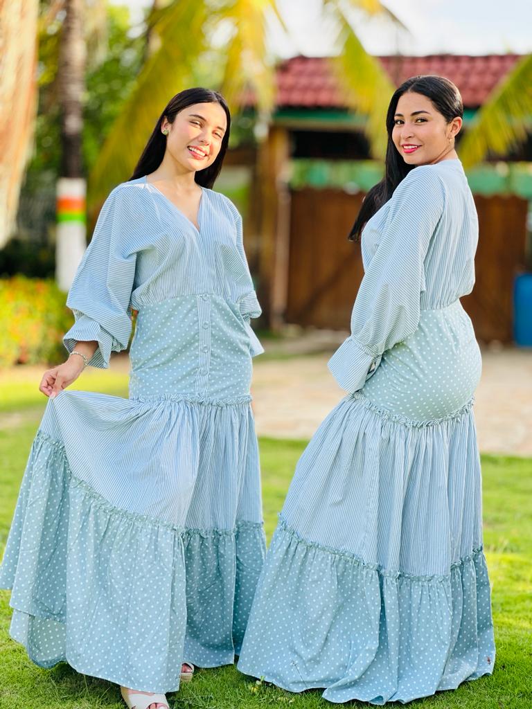 Vestido largo color azul celeste con estampado combinado en Azul celeste suave, que transmite frescura y delicadeza, La parte superior y media del vestido presenta finas rayas verticales blancas, mientras que la parte inferior está decorada con pequeños lunares blancos, creando un contraste visual encantador y original, tiene corte Largo y fluido, ideal para climas cálidos, La falda está formada por paneles con vuelos, que aportan movimiento y un aire romántico, el escote es forma de v, lo que alarga visualmente el cuello y favorece el rostro, sus mangas Tres cuartos, ligeramente abullonadas con terminación suelta, que dan un aire relajado y bohemio, la cintura Con caucho (elástico), marcando suavemente la silueta sin perder la comodidad.