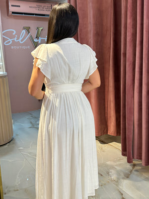 El vestido Ángel se destaca por su delicadeza y silueta femenina. Confeccionado en una tela blanca lisa, suave y fluida, su diseño incorpora un escote en el busto muy sutil, aportando un toque sensual sin perder la elegancia. El fajón, hecho de la misma tela, se ajusta a la cintura, definiendo la figura y añadiendo un aire romántico y cómodo.