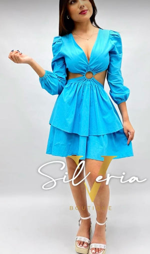 Vestido corto azul cielo con detalle de aro, un diseño moderno y femenino que combina frescura, estilo y un toque de sensualidad sutil.