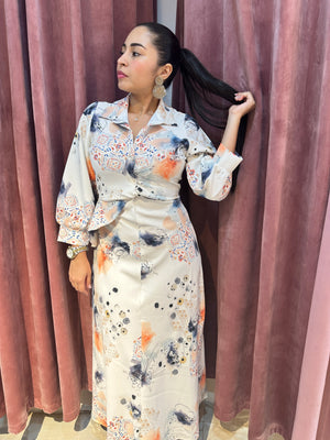 Vestido Mary Lady, es una prenda elegante con un estampado abstracto que le da un toque moderno y puede ser combinado con colores sólidos que contrasten.