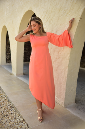 Confeccionado en tela de seda con una textura suave y lujosa. El color naranja añade energía y vitalidad. Su única manga crea un efecto moderno y llamativo, ideal para eventos especiales u ocasiones formales. Este tipo de vestido puede combinarse con accesorios discretos para resaltar su elegancia o con complementos más atrevidos para un look audaz.