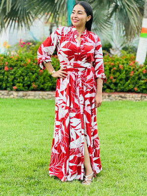Este vestido largo destaca por su imponente estampado de hojas en una armoniosa gama de terracota oscuro, rojizo y blanco, evocando una elegancia cálida y natural.