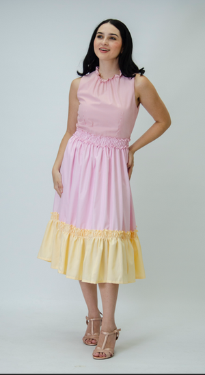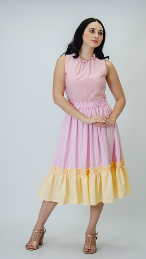 ZARITH, Es un vestido sin mangas (manga sisa), que Presenta un diseño de rayas verticales, lo que estiliza la figura al alargar visualmente el cuerpo. En la parte inferior del vestido, el ruedo está decorado con una arandela o volante, un toque femenino y coqueto al diseño.