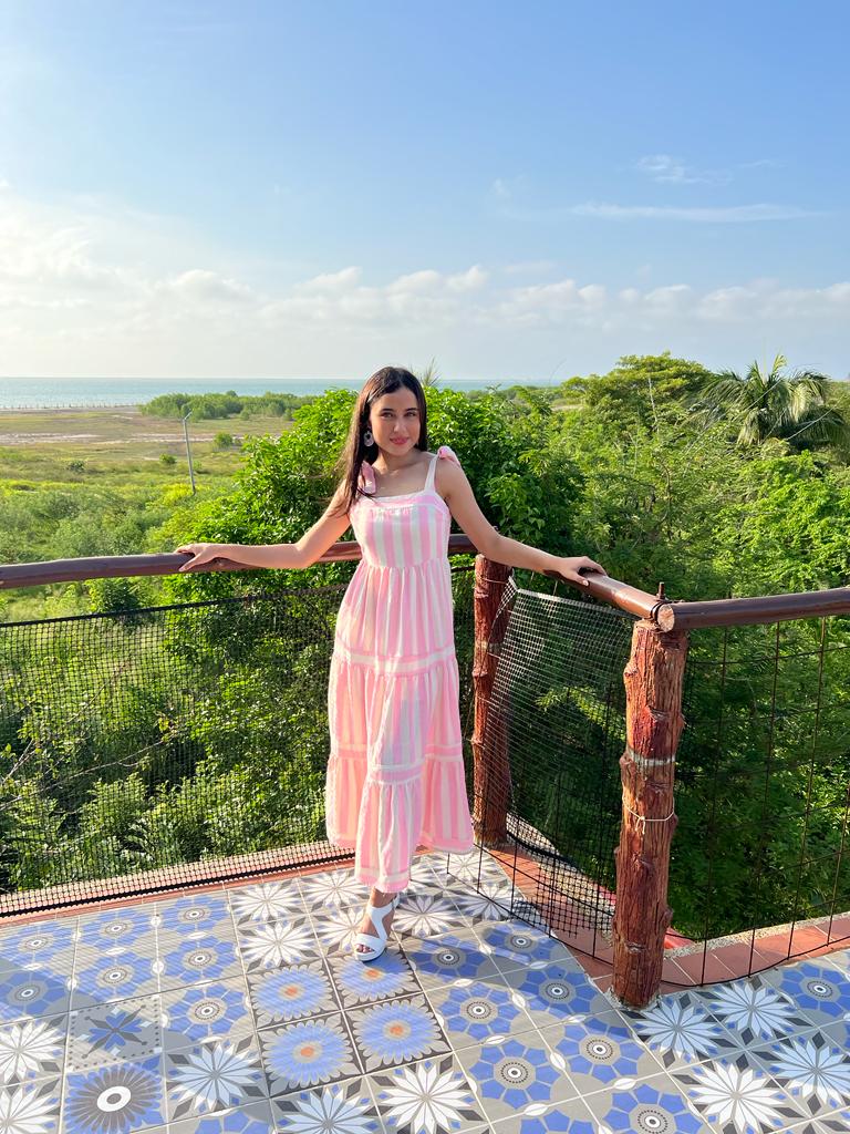 Este vestido irradia un estilo fresco, coqueto y moderno. Está confeccionado en una tela ligera y con caída, ideal para los días soleados o eventos casuales con un toque chic. El diseño presenta rayas verticales alternadas en rosa Barbie —un tono vibrante, alegre y ultra femenino— y beige, un color neutro que equilibra el look con suavidad y sofisticación, Las rayas verticales no solo estilizan la silueta al alargar visualmente el cuerpo, sino que también aportan un toque dinámico y moderno al vestido.