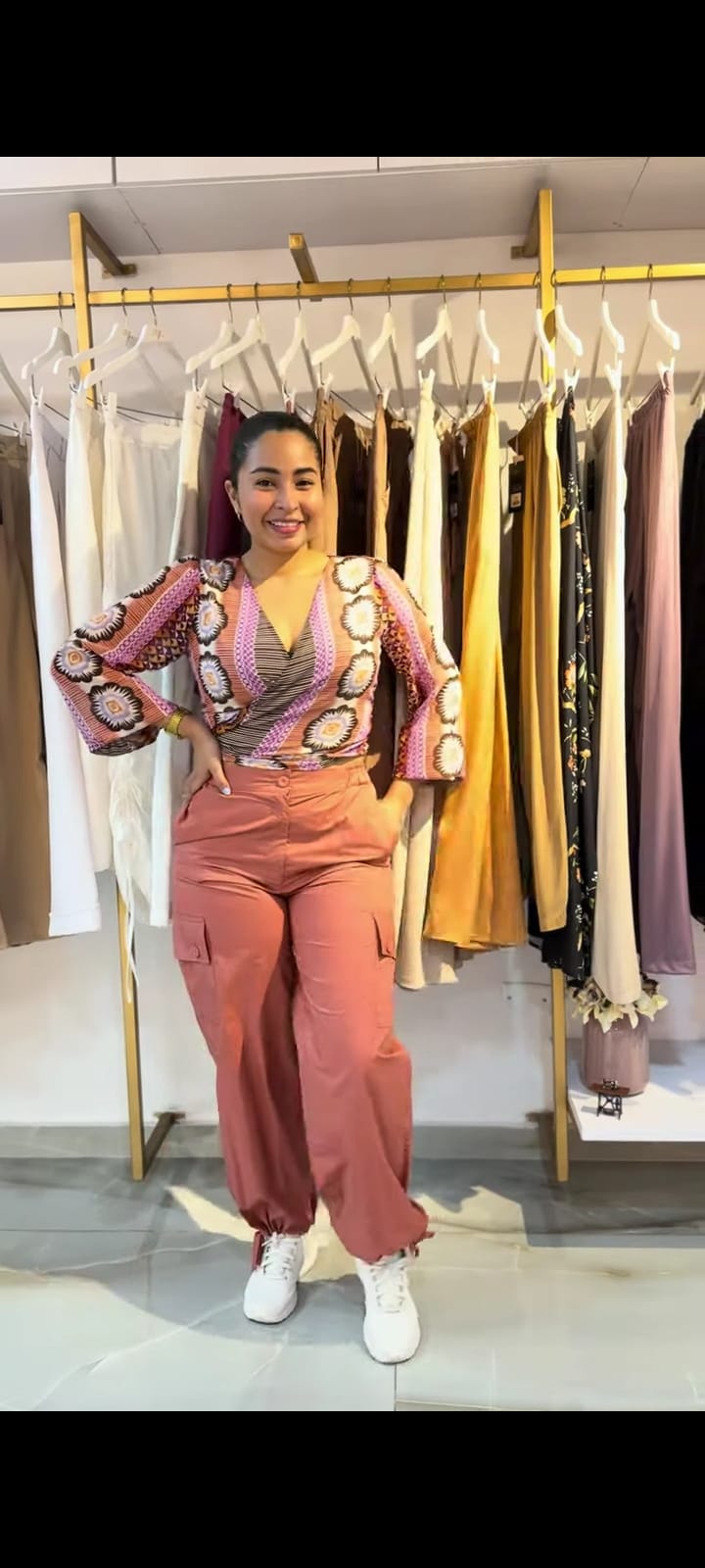 Blusa cruzada de manga larga estampada, confeccionada en una tela ligera y fluida que realza su caída natural y movimiento. Su diseño destaca por un vibrante estampado floral en tonos café, morado y acentos de otros colores suaves, creando un efecto visual cálido y elegante.