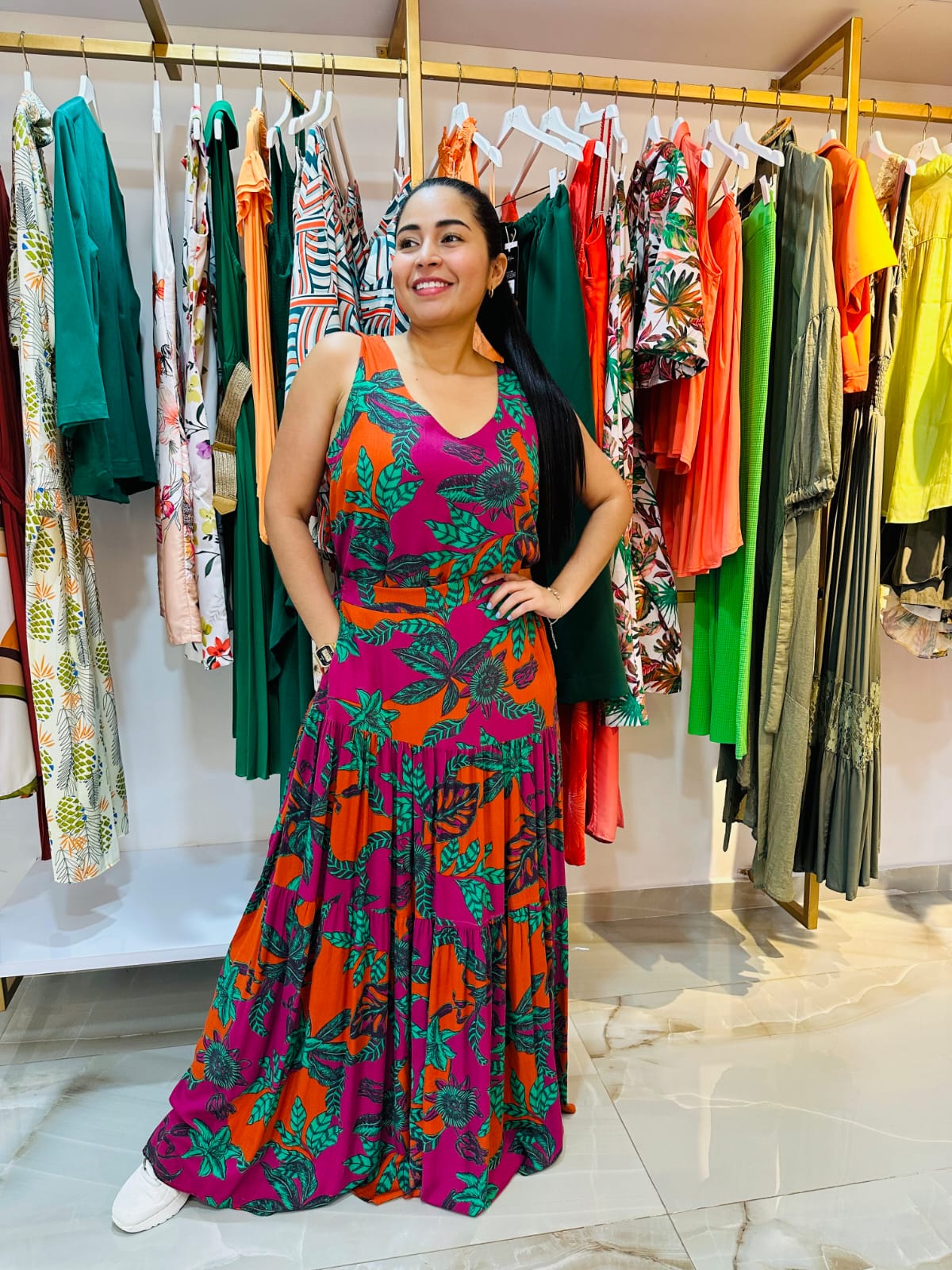 Nuestra falda candela, Tiene un estilo tropical, muy colorido y llamativo. Es una falda larga con colores predominantes; fondo en naranja quemado y fucsia oscuro (morado vino), distribuidos en bloques asimétricos, estampado de hojas grandes en verde esmeralda con bordes y detalles en negro, de estilo tropical/botánico, con hojas de distintos tamaños y formas, lo que le da un aire veraniego y relajado, corte Recto y suelto, ideal para dar comodidad y frescura, tela ligera. Es una prenda muy alegre y perfecta para el verano, vacaciones o un look casual, pero con mucha personalidad.