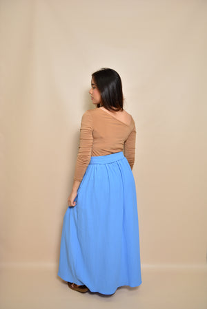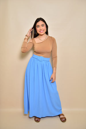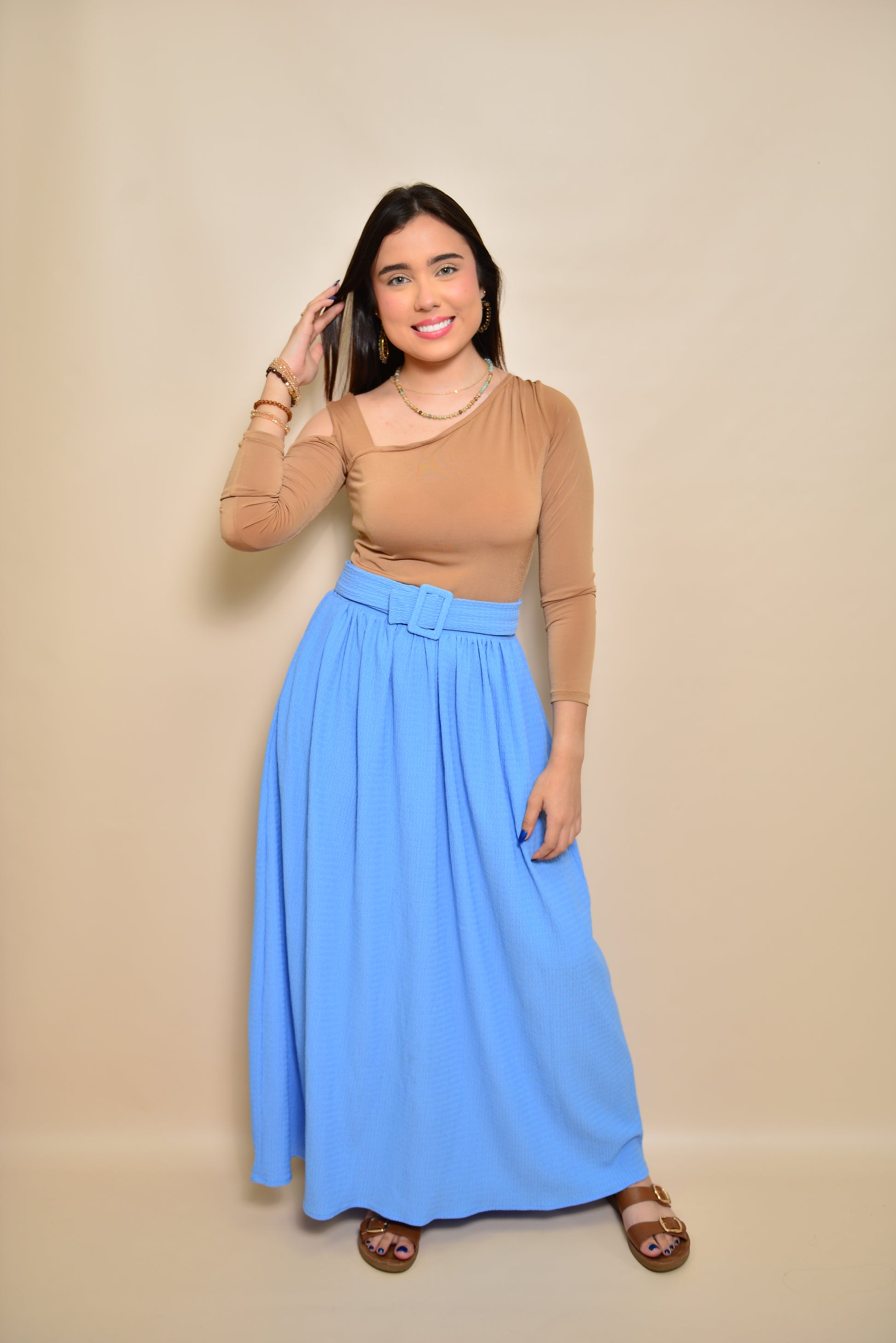 Esta falda azul celeste está confeccionada en tejido 98% poliéster y 2% elastómero, con correa ajustable y elástico en la cintura para lograr el ajuste perfecto. El diseño resalta por su delicadeza, aportando un aire romántico y natural. Ideal para ocasiones casuales o semi-formales, su estilo ligero y aireado ofrece comodidad sin sacrificar sofisticación.