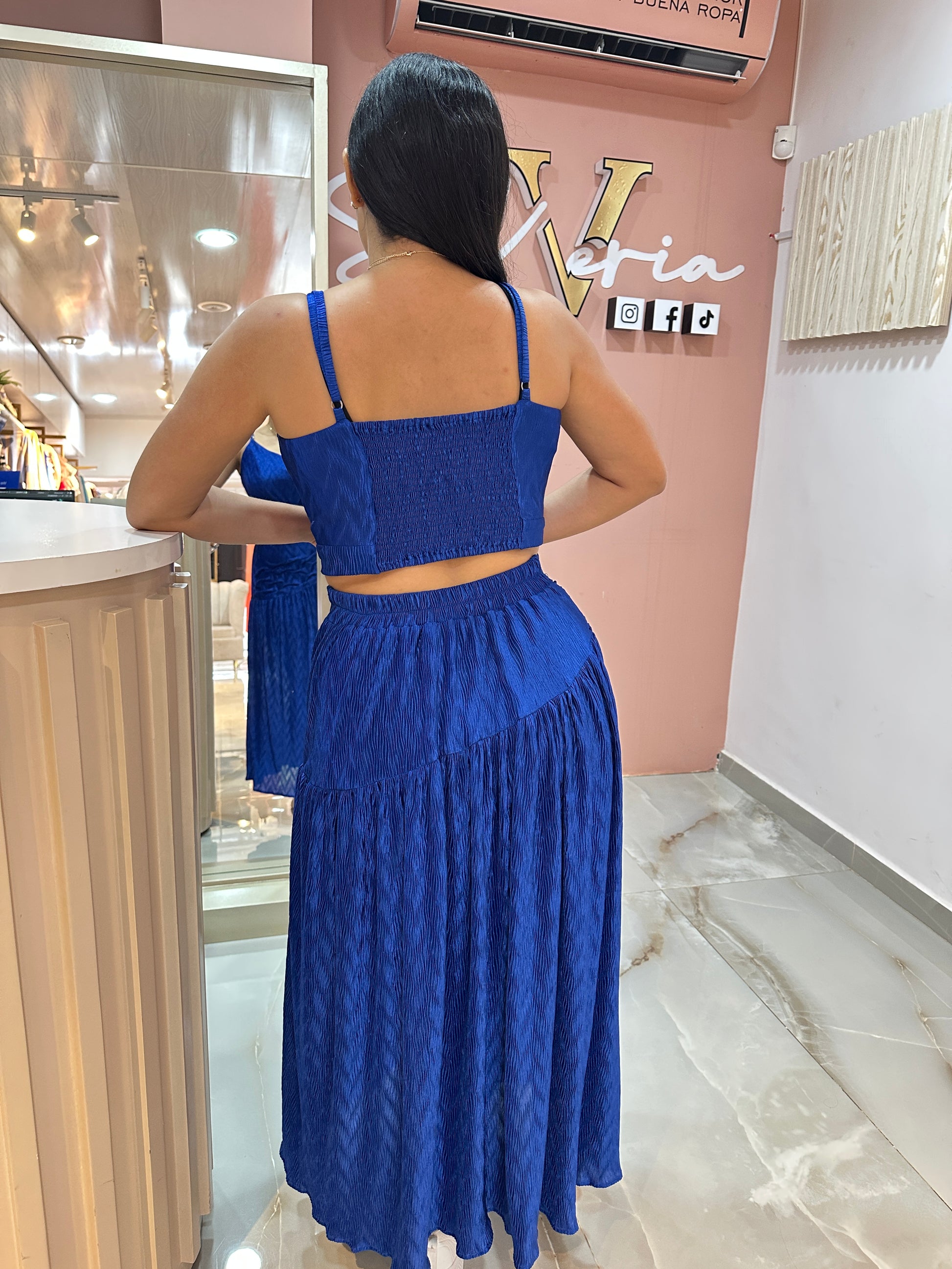 Es una falda confeccionada en un tejido de apariencia plisada con textura de ondas que crea un efecto visual dinámico y elegante. La falda tiene un corte suelto y fluido que le aporta movimiento y frescura al caminar, ideal para un look relajado pero sofisticado.