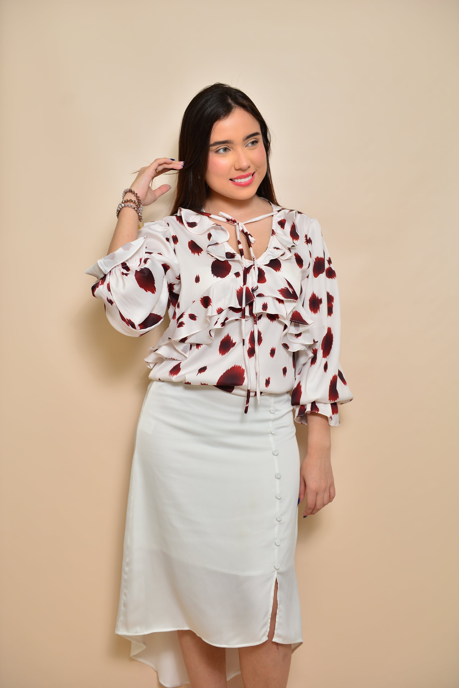 Esta falda en color blanco es una prenda de estilo audaz y contemporáneo. El corte asimétrico le da un toque moderno y dinámico, mientras que los botones en el frente añaden un detalle elegante y llamativo, completando el diseño con un aire sofisticado. Ideal para un look chic y original, perfecta para ocasiones especiales o eventos donde se desea destacar.