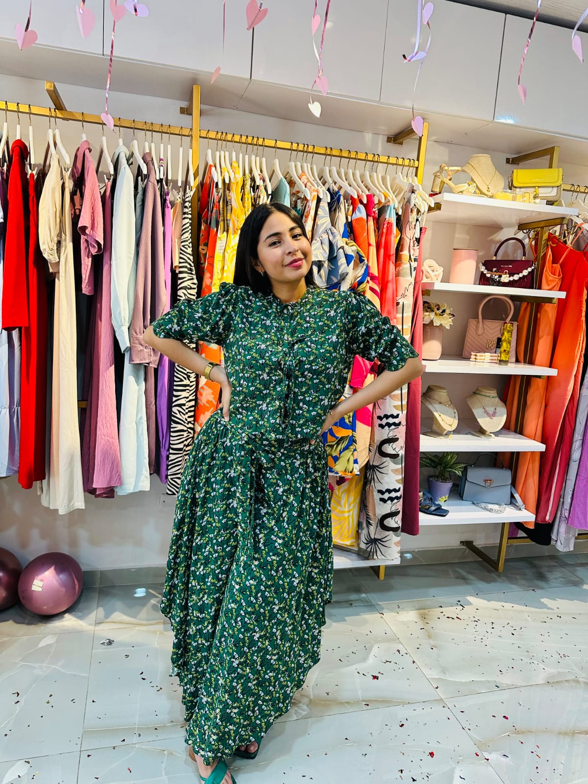 Este Set es con un estampado verde continúa o complementa el de la blusa, creando un conjunto armonioso y muy vibrante. Ideal para días de verano, vacaciones o eventos informales.