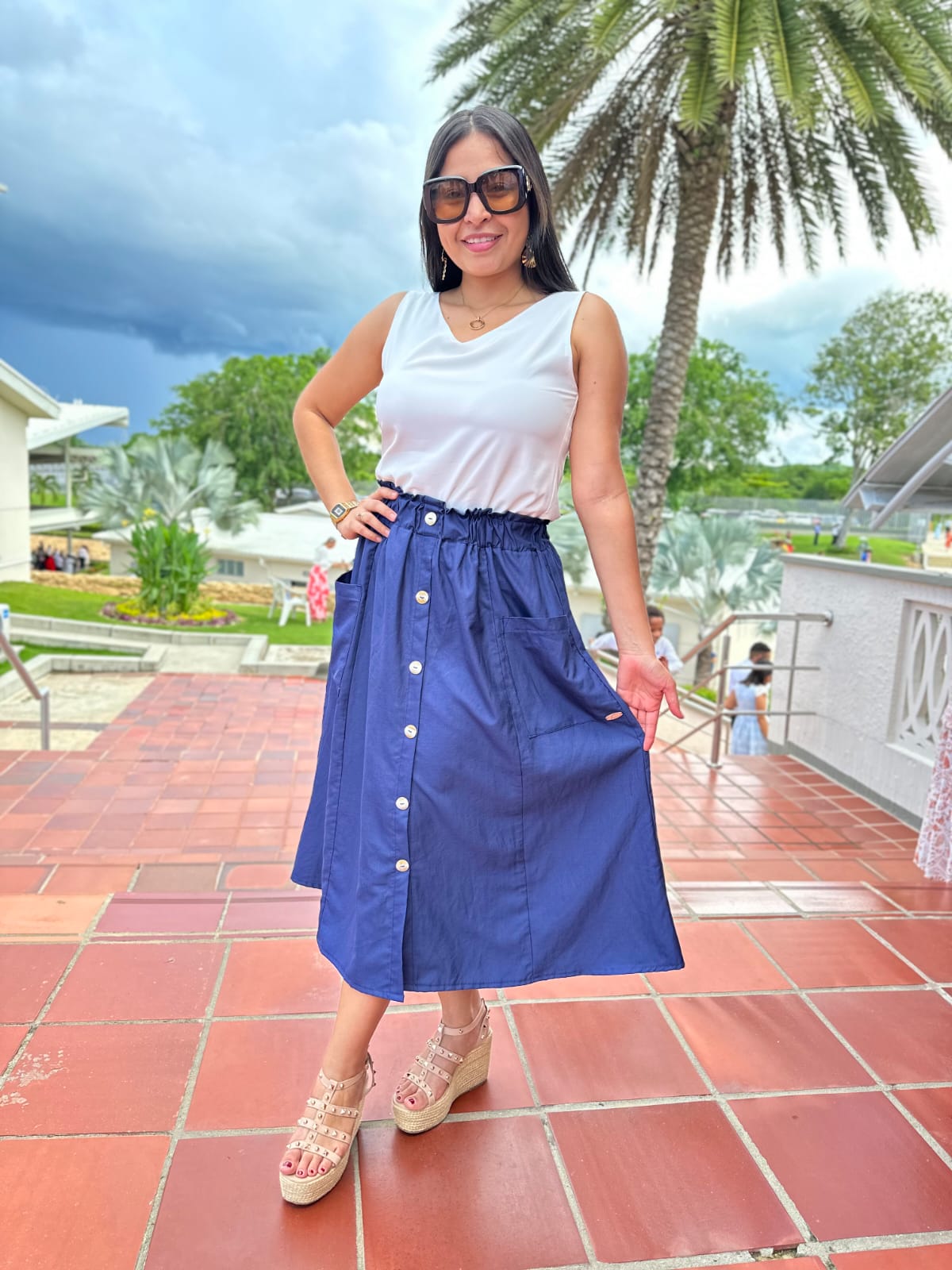 Esta falda es de estilo midi, en un tono azul marino. Tiene una cintura alta con elástico fruncido que le da un ajuste cómodo y favorecedor. Al frente lleva una hilera de botones blancos que funcionan como detalle decorativo, y también tiene bolsillos laterales grandes que le dan un aire relajado y práctico. La tela parece ligera y con buena caída.