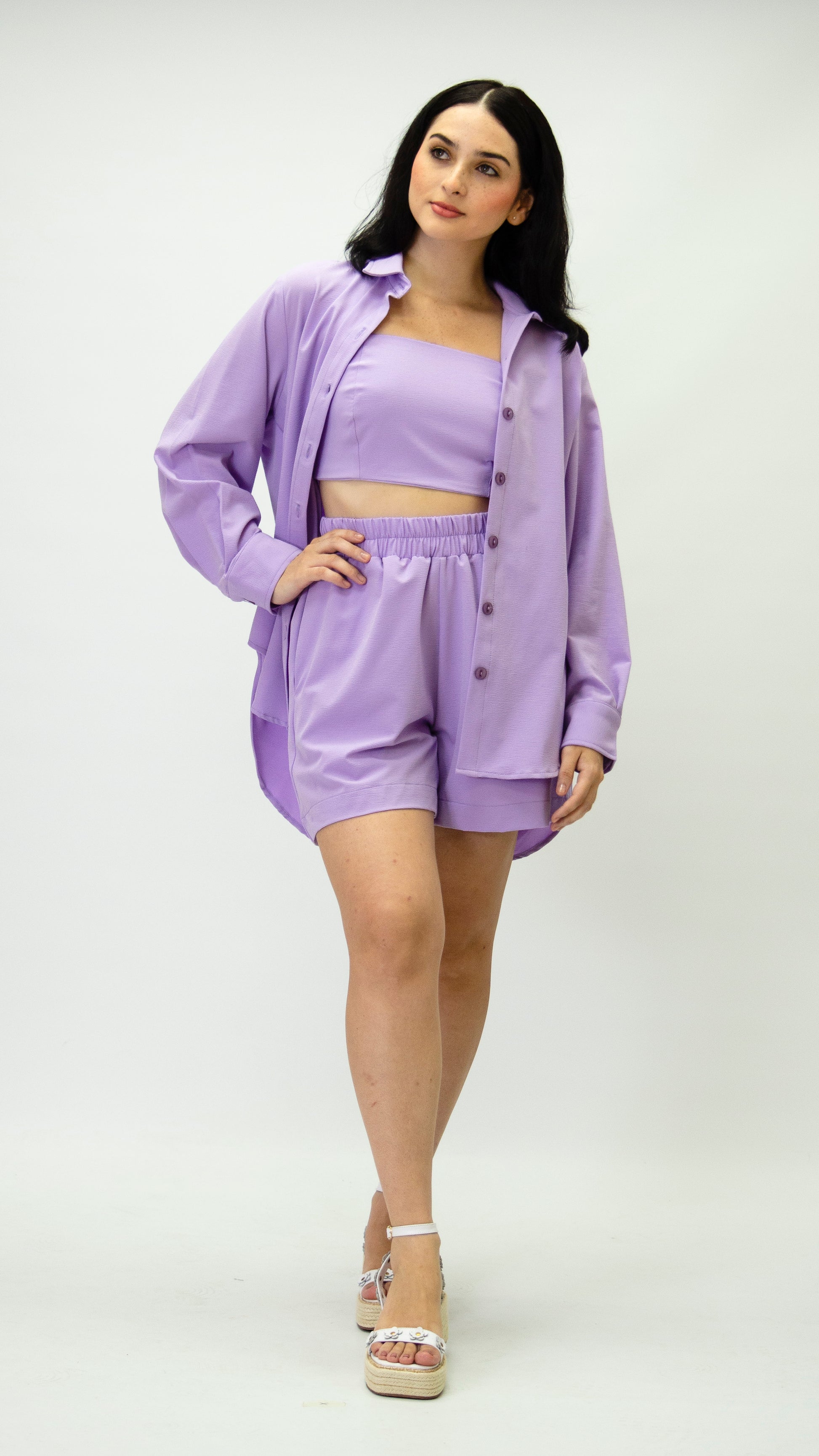 Este hermoso conjunto combina comodidad y estilo en un look fresco y moderno. La camisa de manga larga, en un suave tono lila, ofrece un corte oversize con detalles clásicos como cuello camisero y botones frontales, ideal para lucir tanto cerrada como abierta sobre una prenda básica. El short a juego, confeccionado en el mismo tono, cuenta con una cintura alta y ajuste cómodo, realzando la silueta sin perder libertad de movimiento. El conjunto incluye top bajo la camisa.