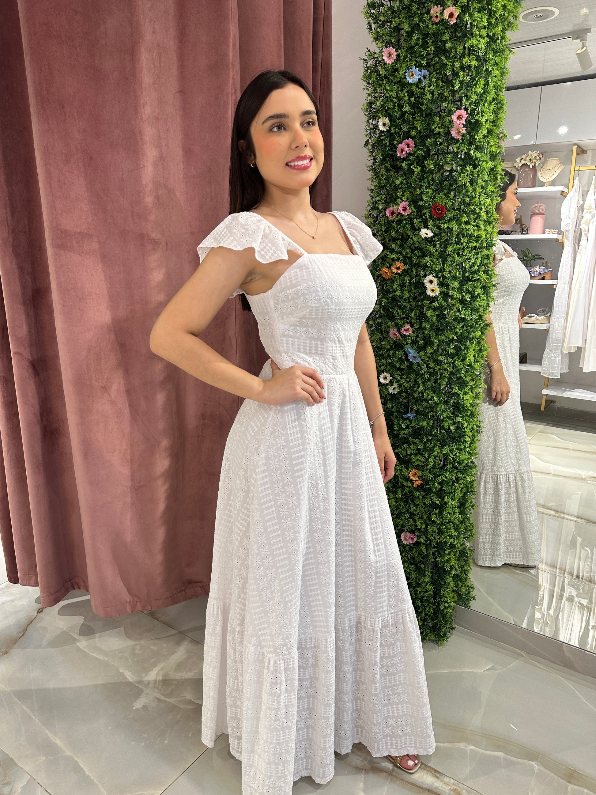 Este vestido largo blanco en ojalillo es una prenda clásica, femenina y atemporal que evoca frescura y romanticismo. Confeccionado en un tejido de algodón bordado, el ojalillo aporta textura y delicadeza gracias a sus pequeños calados florales o geométricos, que dejan entrever la piel de forma sutil y elegante.