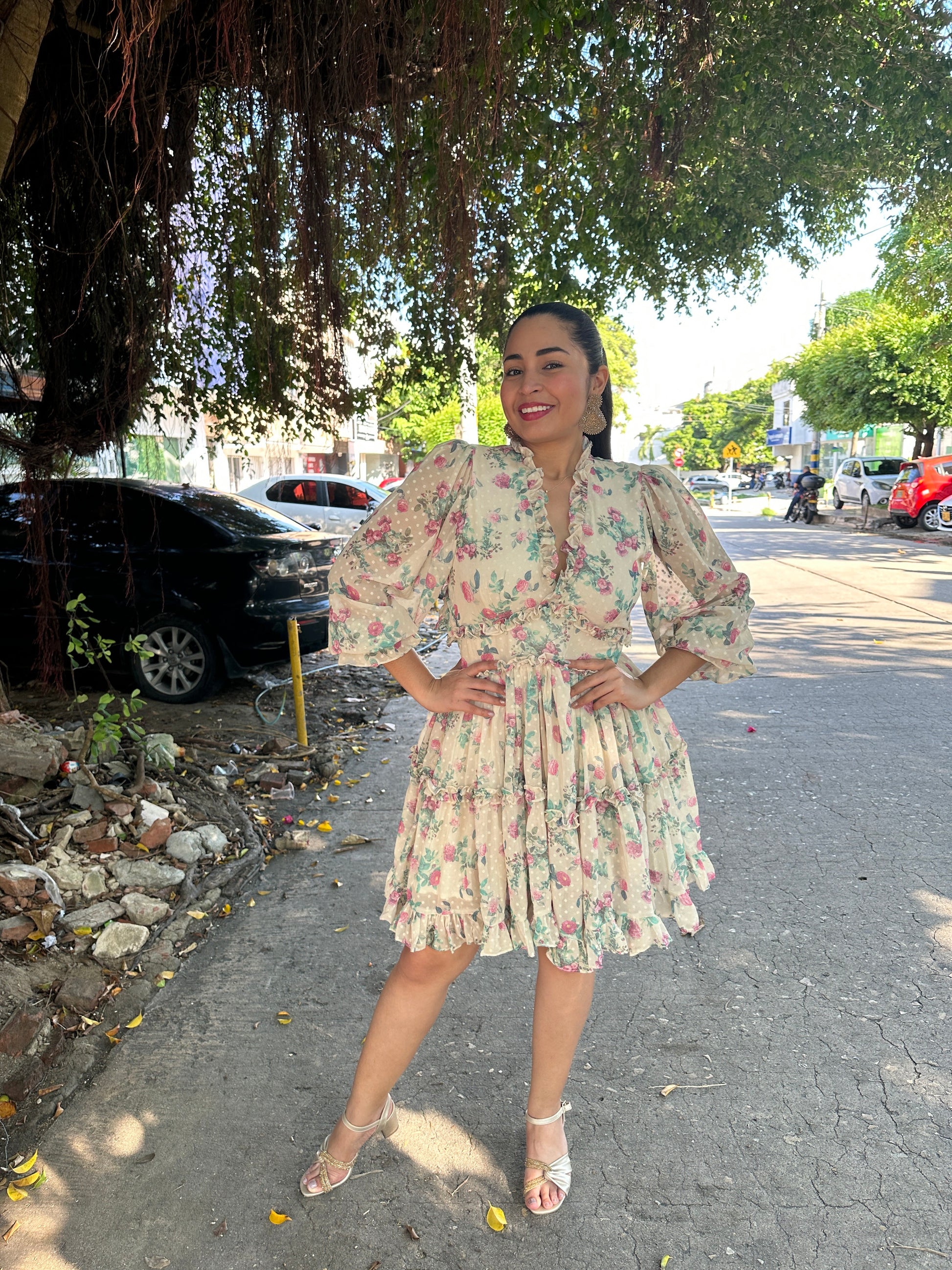 Este vestido floreado en chifón con manga larga tiene un diseño delicado y fluido, ideal para ocasiones elegantes y frescas. La tela de chifón, ligera y suave, presenta un patrón de flores en tonos suaves, lo que le da un aire romántico y femenino. Las mangas largas están hechas de este mismo material translúcido, lo que permite que la prenda sea cómoda y fresca al mismo tiempo. En la parte posterior, el vestido cuenta con un ligero escote que agrega un toque sutil de sensualidad, sin ser excesivo, brindando un aire cómodo y discreto.