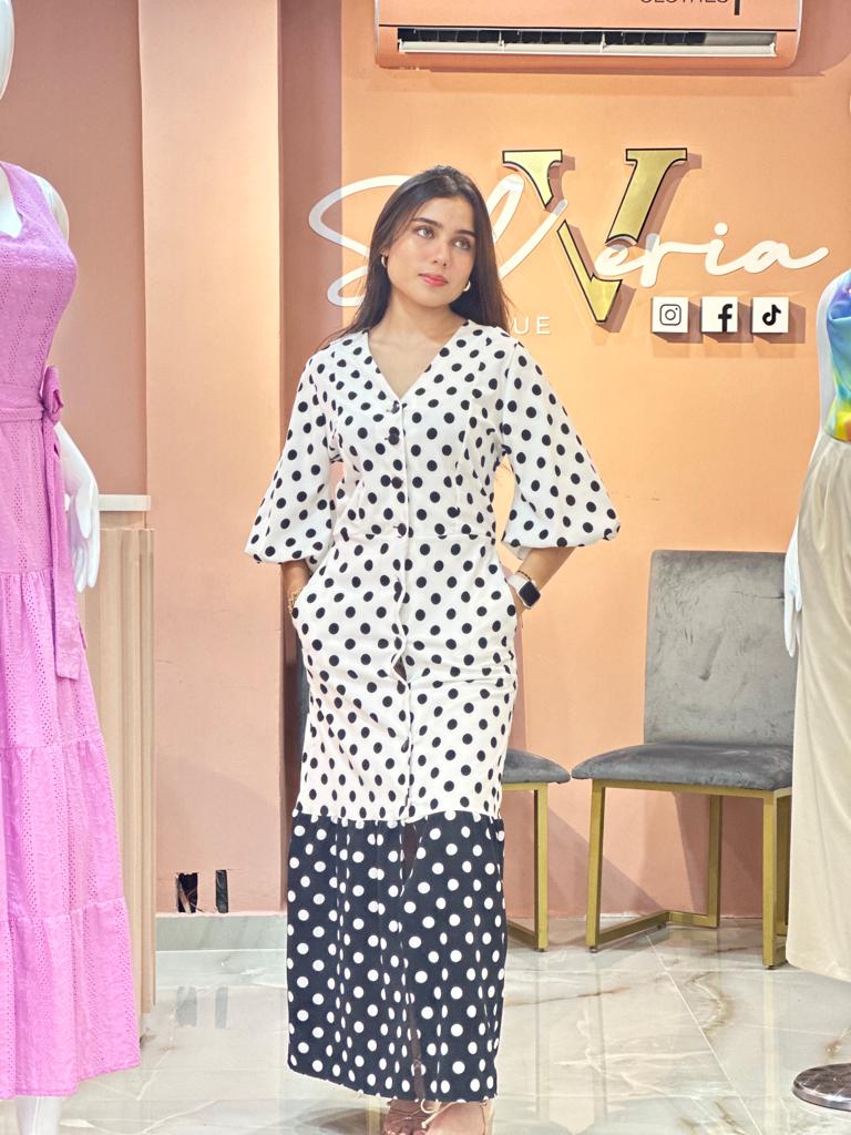 Es un vestido largo, que combina los colores blanco y negro con puntos y mangas abullonadas,