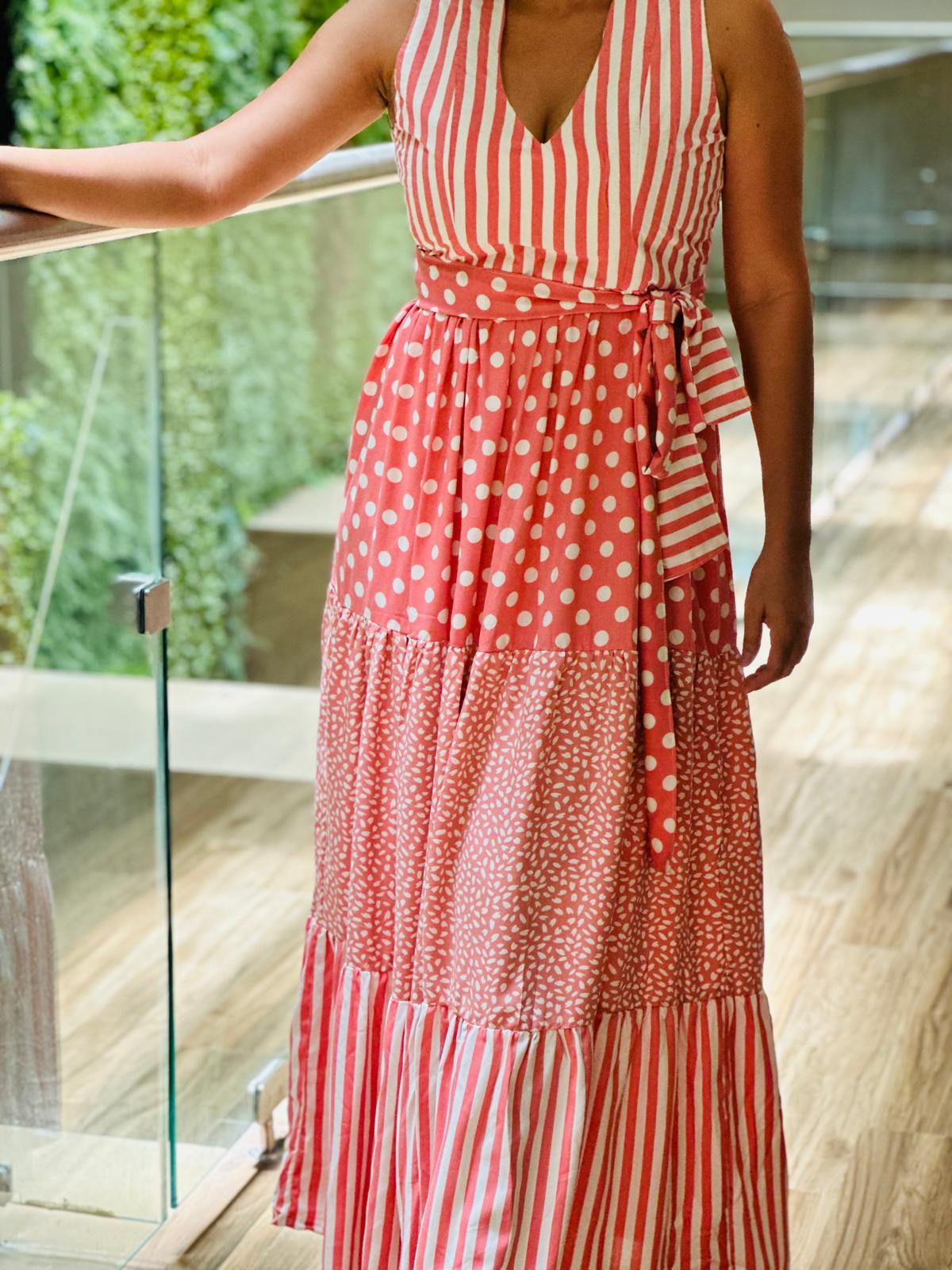 Este vestido es una prenda fresca y vibrante, ideal para un look relajado y veraniego. Con su diseño fluido y cómodo, este vestido ofrece una silueta larga y ligera que favorece el movimiento. El estampado polka dots y de líneas en contraste, en colores peach fuzz y blanco mezclados de manera artística, aporta un toque original, convirtiéndolo en una opción perfecta para días soleados o eventos tanto formales como informales. Su estilo sin mangas lo hace ideal para el calor, mientras que su diseño único garantiza una apariencia fresca y moderna.