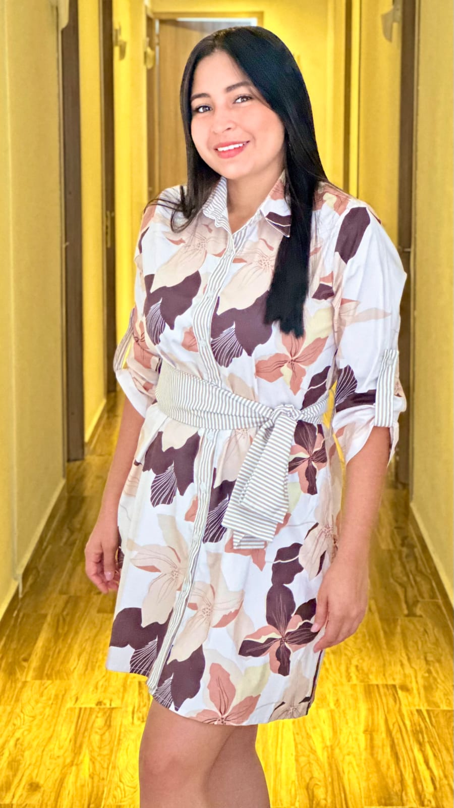 Este vestido aporta calidez y sofisticación al look. Su diseño incorpora detalles en rayas beige que crean contraste sutil y realzan la silueta. Su estilo es corte corto, ideal para lucir fresca y estilizada en cualquier ocasión.